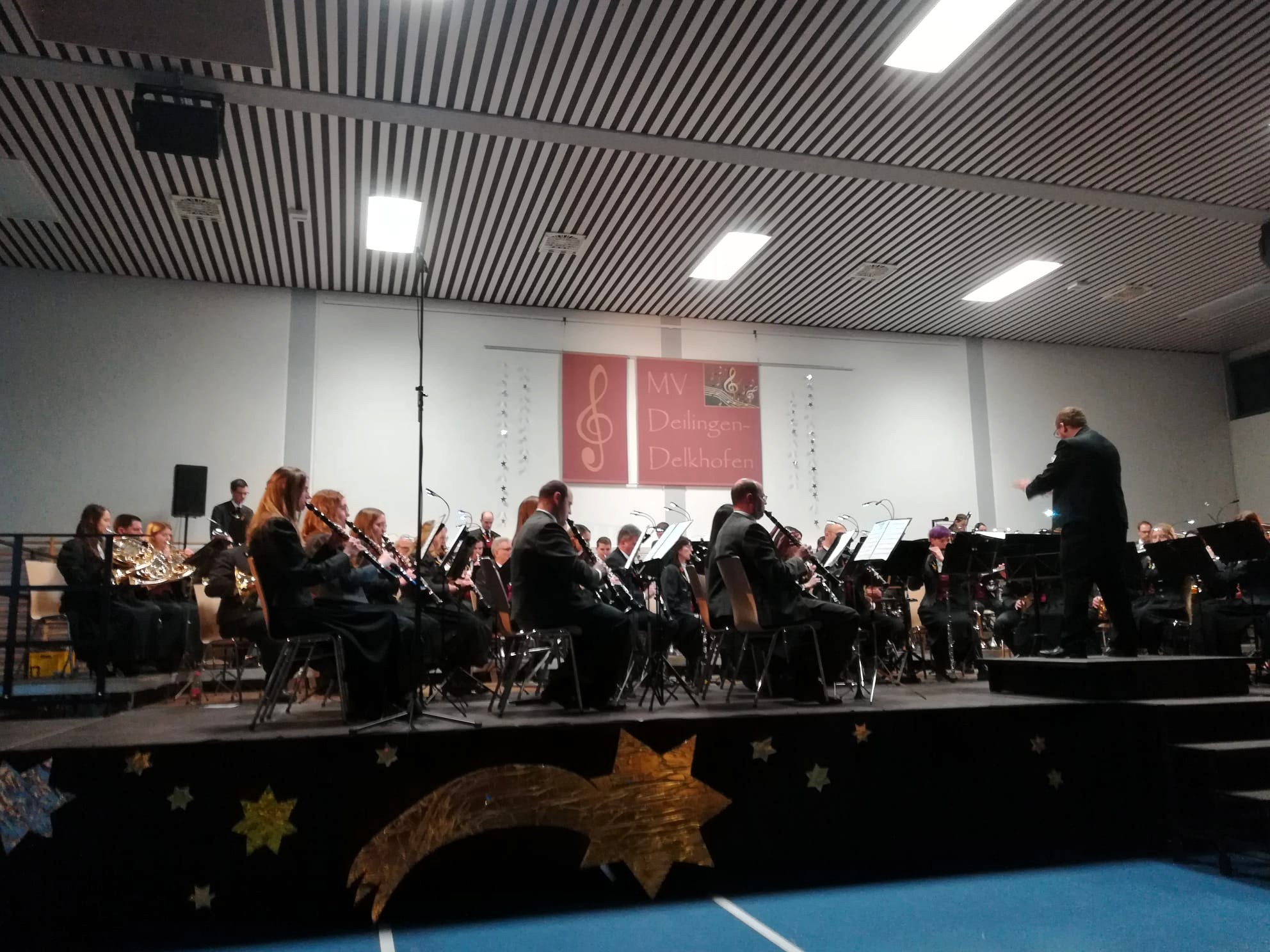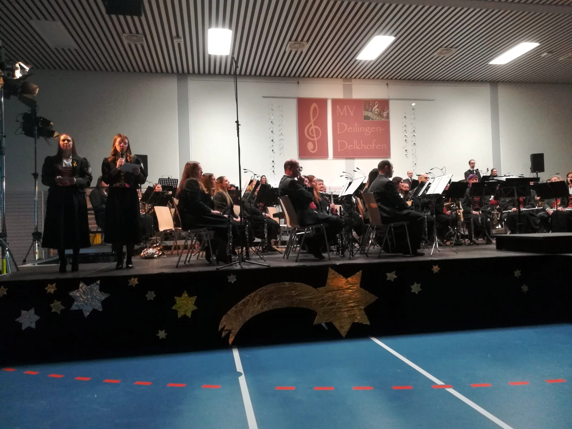 Anlässlich unseres Weihnachtskonzerts 2025 wurde die Gemeindehalle unter dem Motto „In einer fernen Galaxie“ zum Schauplatz einer besonderen musikalischen Reise. Schon beim Eintreten führten die passende Beleuchtung, die Dekoration und eine funkelnde Diskokugel die Besucher in eine andere Welt.